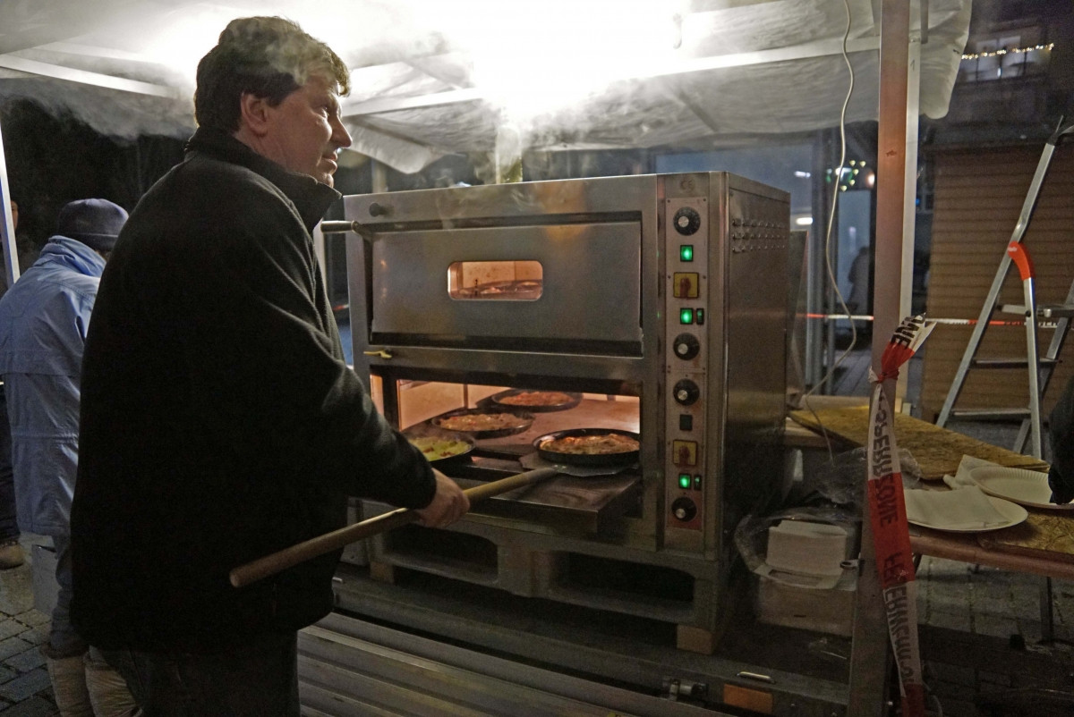 Einer der Hits des lukullischen Marktangebotes: Der Flammkuchen von Alfred Merten, seiner Frau Andrea und Helfern - mit Glühwein am Stand der evangelischen Kirchengemeinde (Bild).